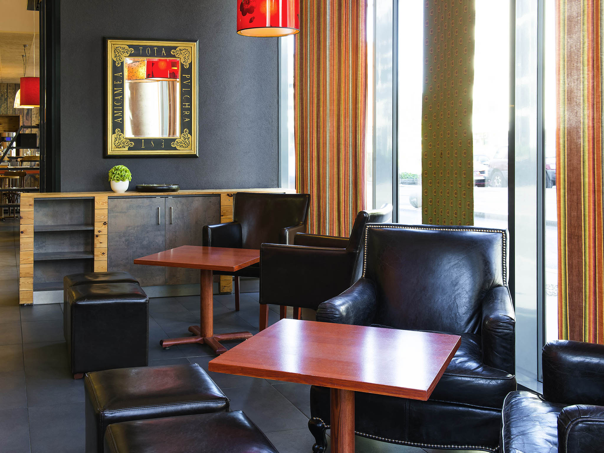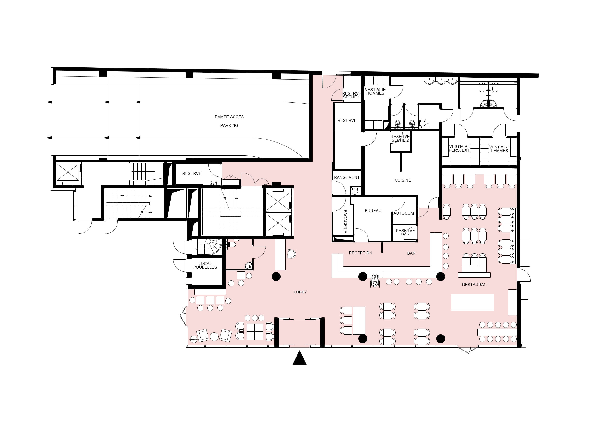 Les espaces communs reprennent cette identité visuelle forte, avec un mobilier simple et des éclairages modernes, assurant la cohérence globale du lieu.