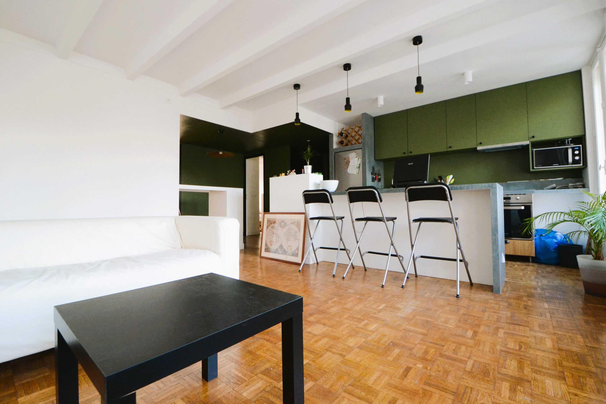 L’agencement d’origine, cloisonné et peu fonctionnel, a été entièrement repensé. Les cloisons du couloir et de la cuisine ont été supprimées afin de créer un espace de vie ouvert, plus fluide et largement éclairé par la lumière naturelle. Un espace bureau a été intégré à cette nouvelle organisation, répondant aux besoins actuels de télétravail et d’étude.
