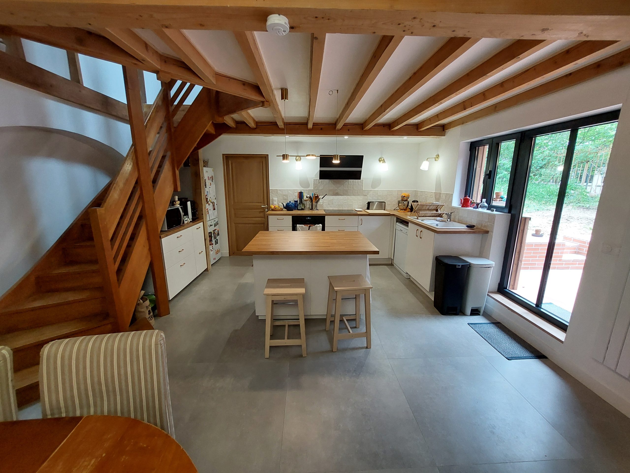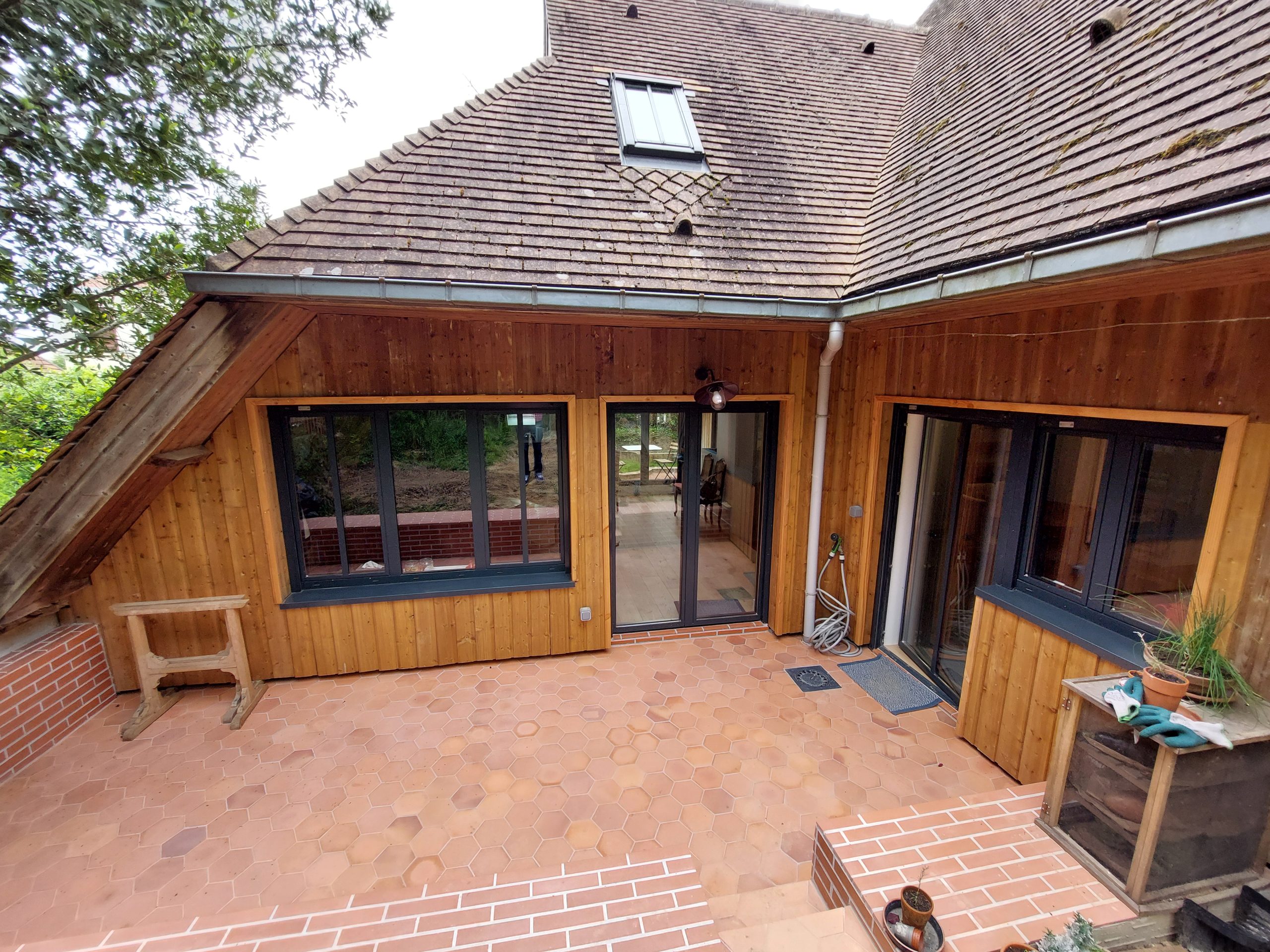 L’agrandissement ciblé des ouvertures renforce la relation avec l’extérieur et favorise les apports de lumière naturelle. Le projet aboutit à une maison rénovée, équilibrant respect du passé et adaptation contemporaine, offrant un cadre de vie harmonieux, lumineux et fonctionnel, fidèle à l’esprit initial du lieu.