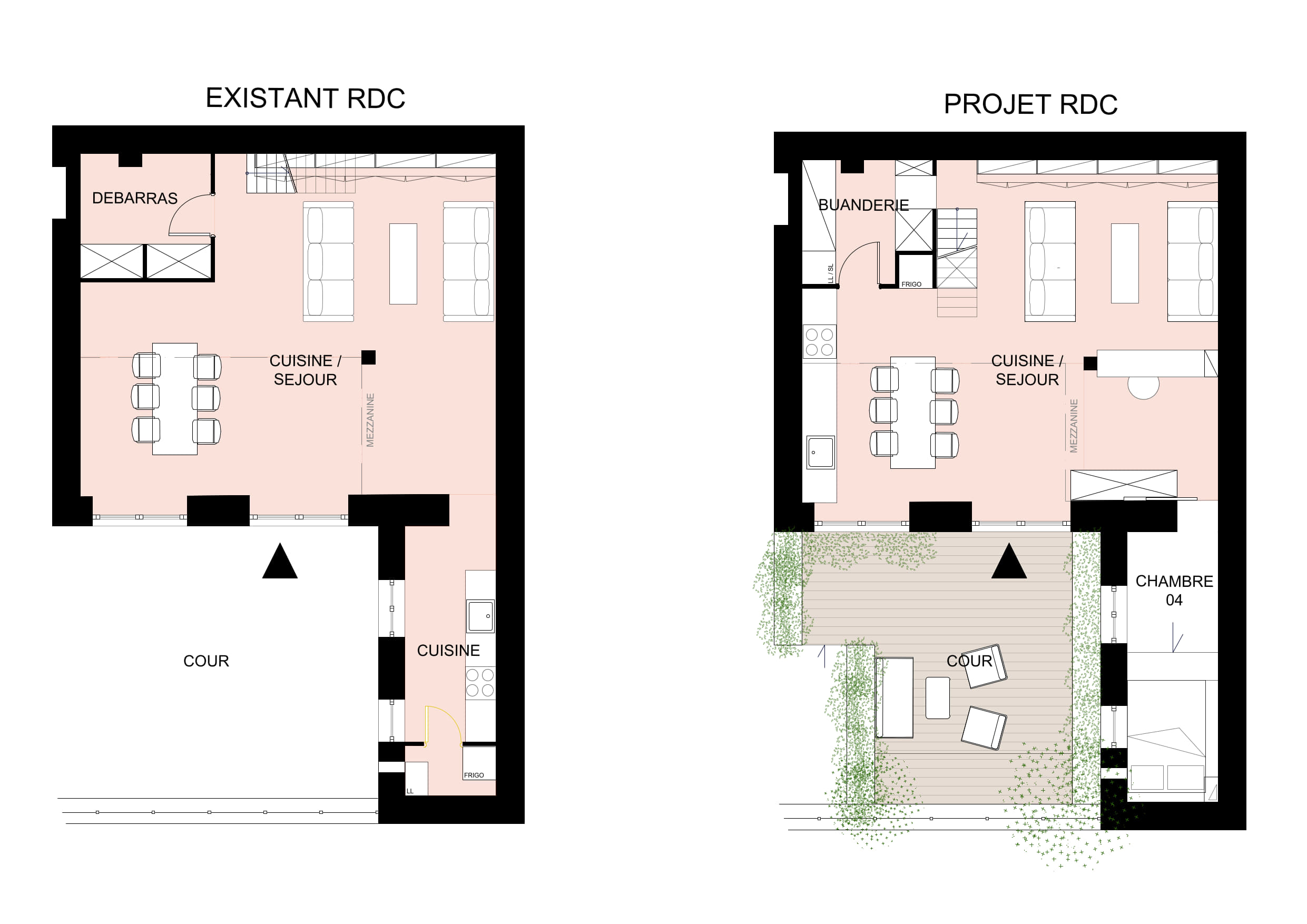 Conçue comme une véritable agora, la pièce de vie offre un espace généreux et convivial, prolongé par une relation directe avec la cour végétalisée en cœur d’îlot, renforçant la luminosité et la qualité de vie au sein de l’appartement.