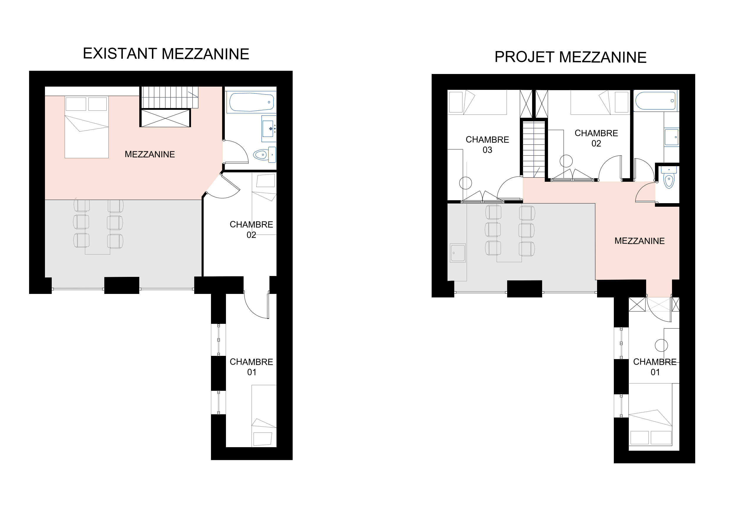 Cet appartement canut, initialement composé d’une pièce principale avec mezzanine, a fait l’objet d’une restructuration ambitieuse afin de répondre aux besoins d’une famille monoparentale avec trois enfants, dans un contexte de surface contrainte.