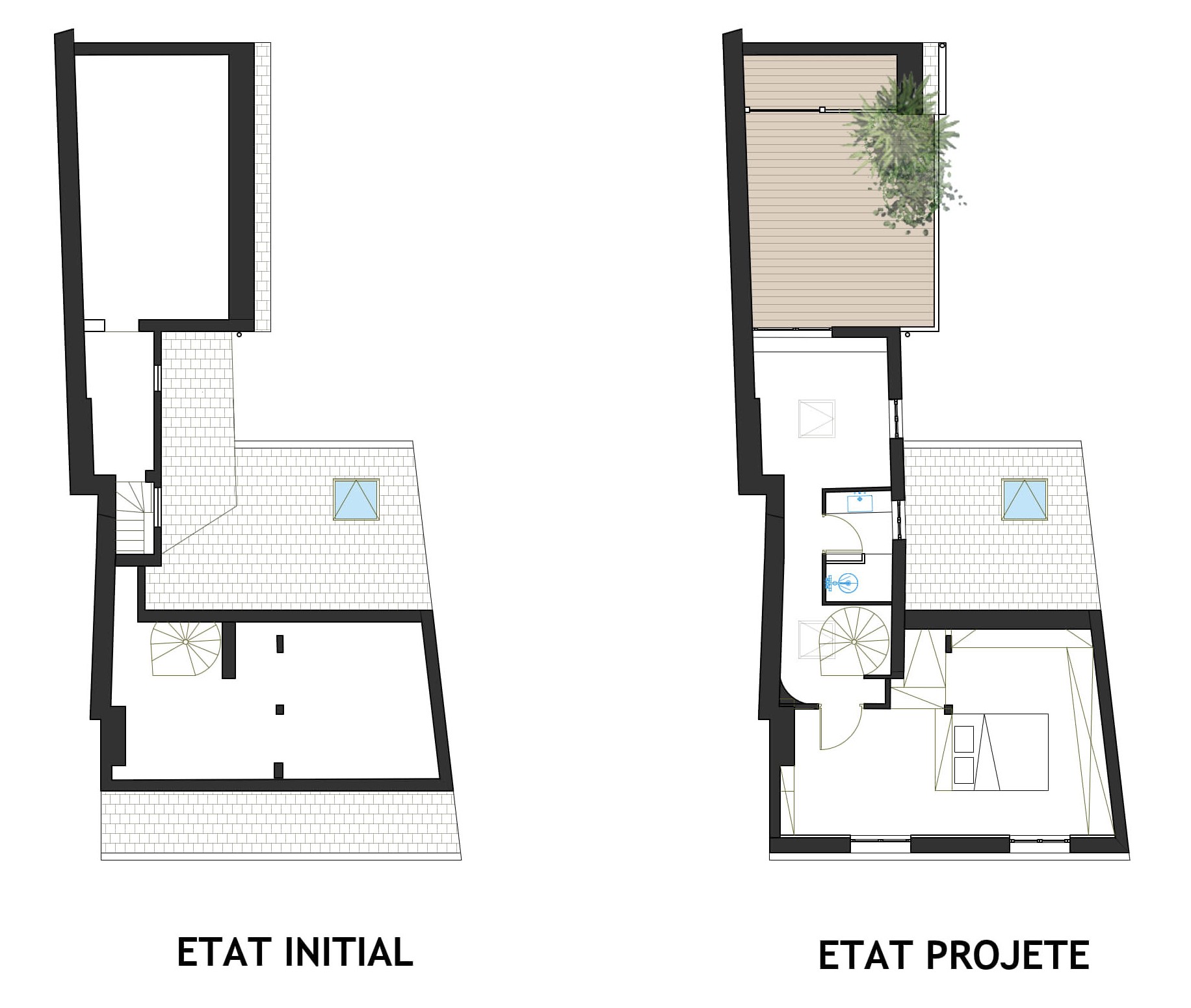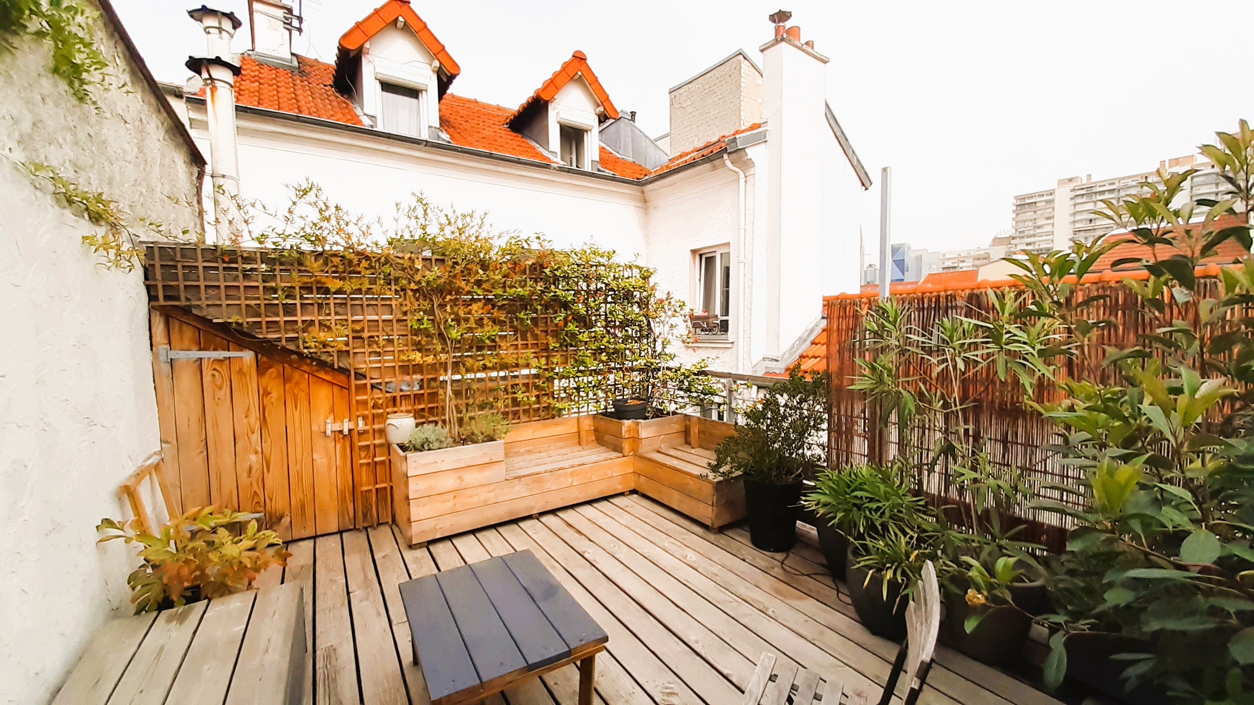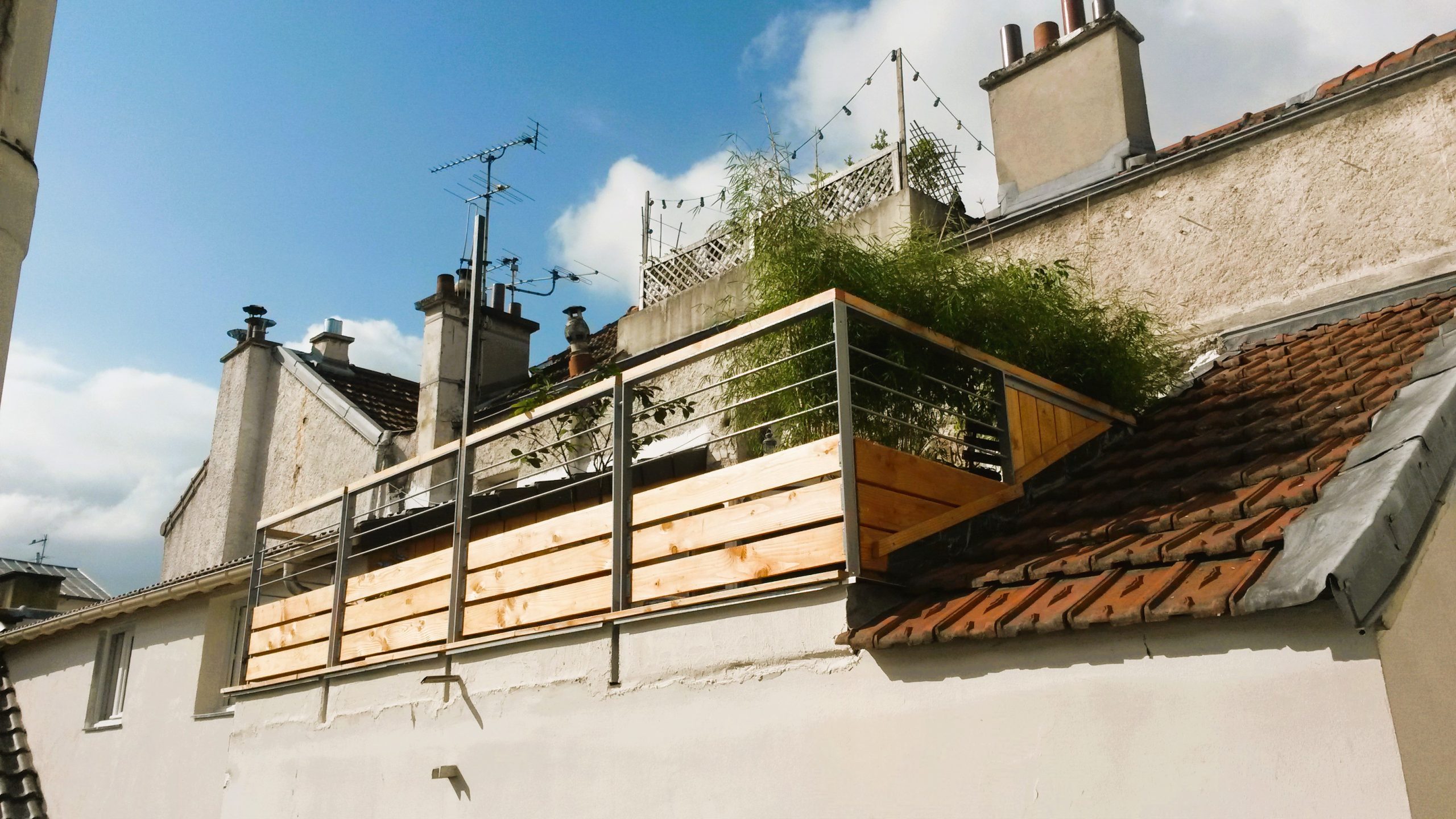 Cette intervention permet de créer une terrasse privative en toiture, offrant à l’appartement un accès direct à l’air libre et à l’ensoleillement, rare dans ce type de contexte urbain dense.