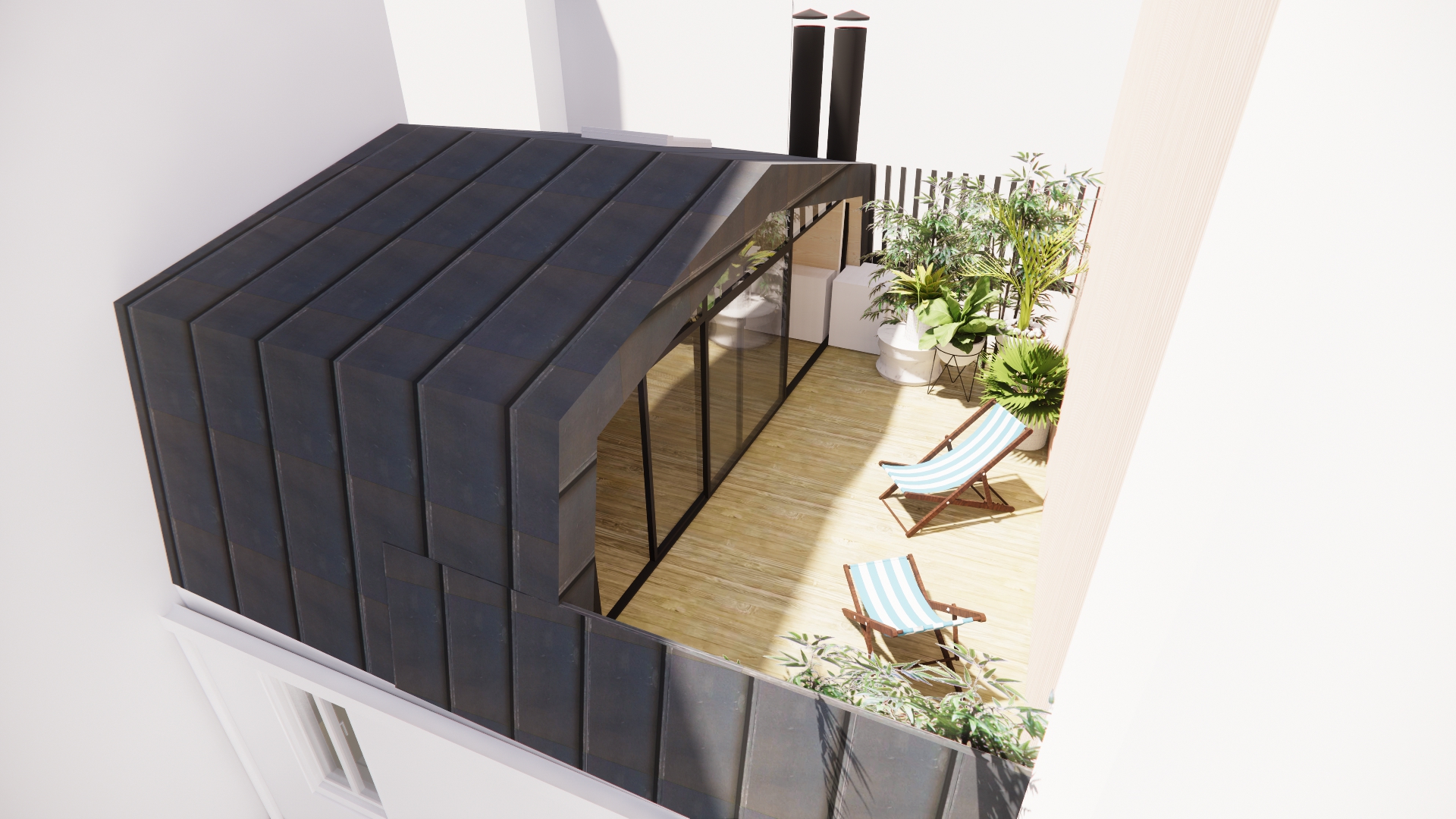Réalisée en ossature bois et habillée d’un bardage en zinc noir, la surélévation affirme une écriture contemporaine tout en s’intégrant durablement dans le tissu urbain. L’intervention permet la création de chambres supplémentaires et l’aménagement d’un accès extérieur bénéficiant d’un ensoleillement direct.