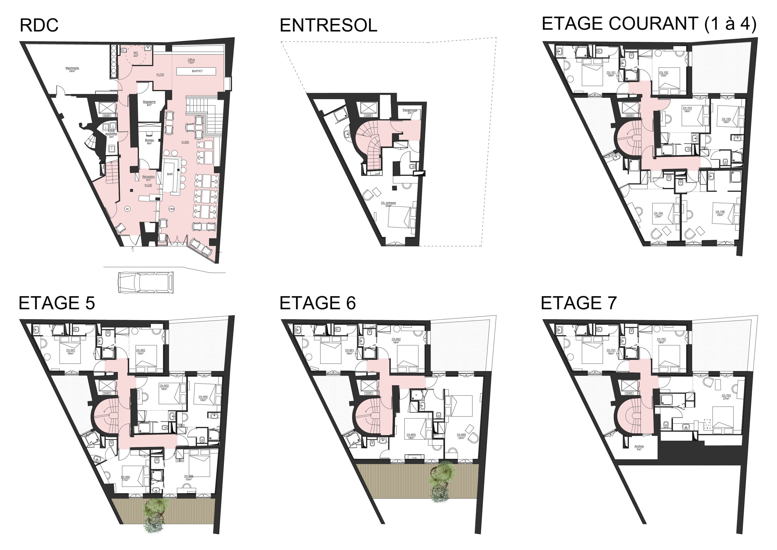 Le projet concerne la restructuration complète d’un immeuble parisien existant accueillant un hôtel de 38 chambres et un lobby.